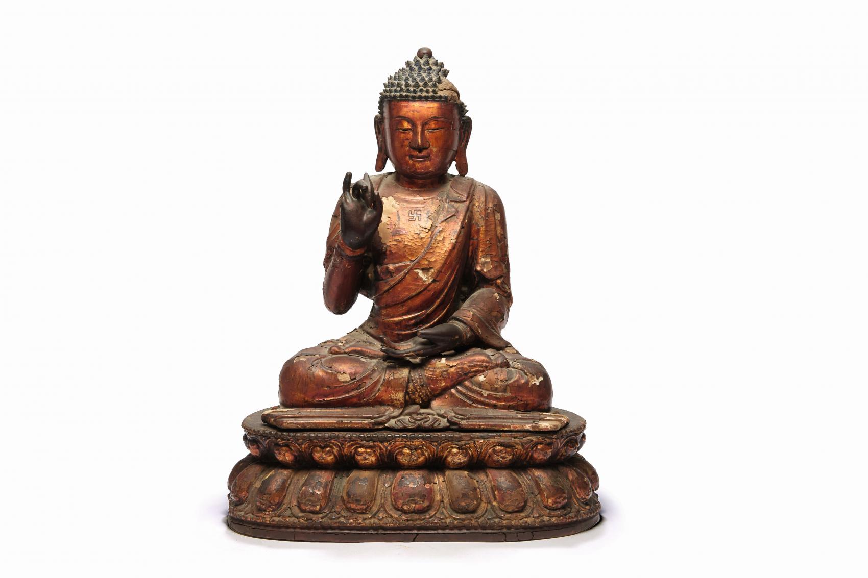 | Rare et grand Bouddha en bois sculpté et laqué or rouge